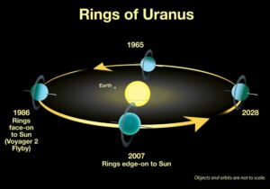 天王星が太陽を一周(公転)するには、地球の時間で約84年かかります。自転軸が横倒しになっているため、ある時期には北極がずっと太陽の方を向き続けます。